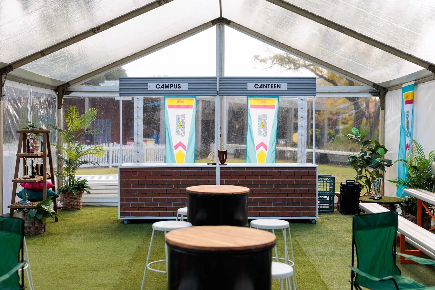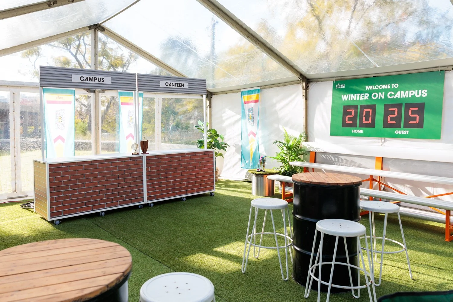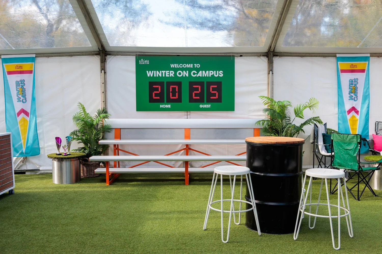 Winter-retro-sports themed design and styling for Curtin University student activation. Featuring stadium seating, custom printed scoreboard, vintage trophies, cosy seating areas, canteen-style cart, and styling to create a unique placemaking moment inspired by the sports events of the 90’s.