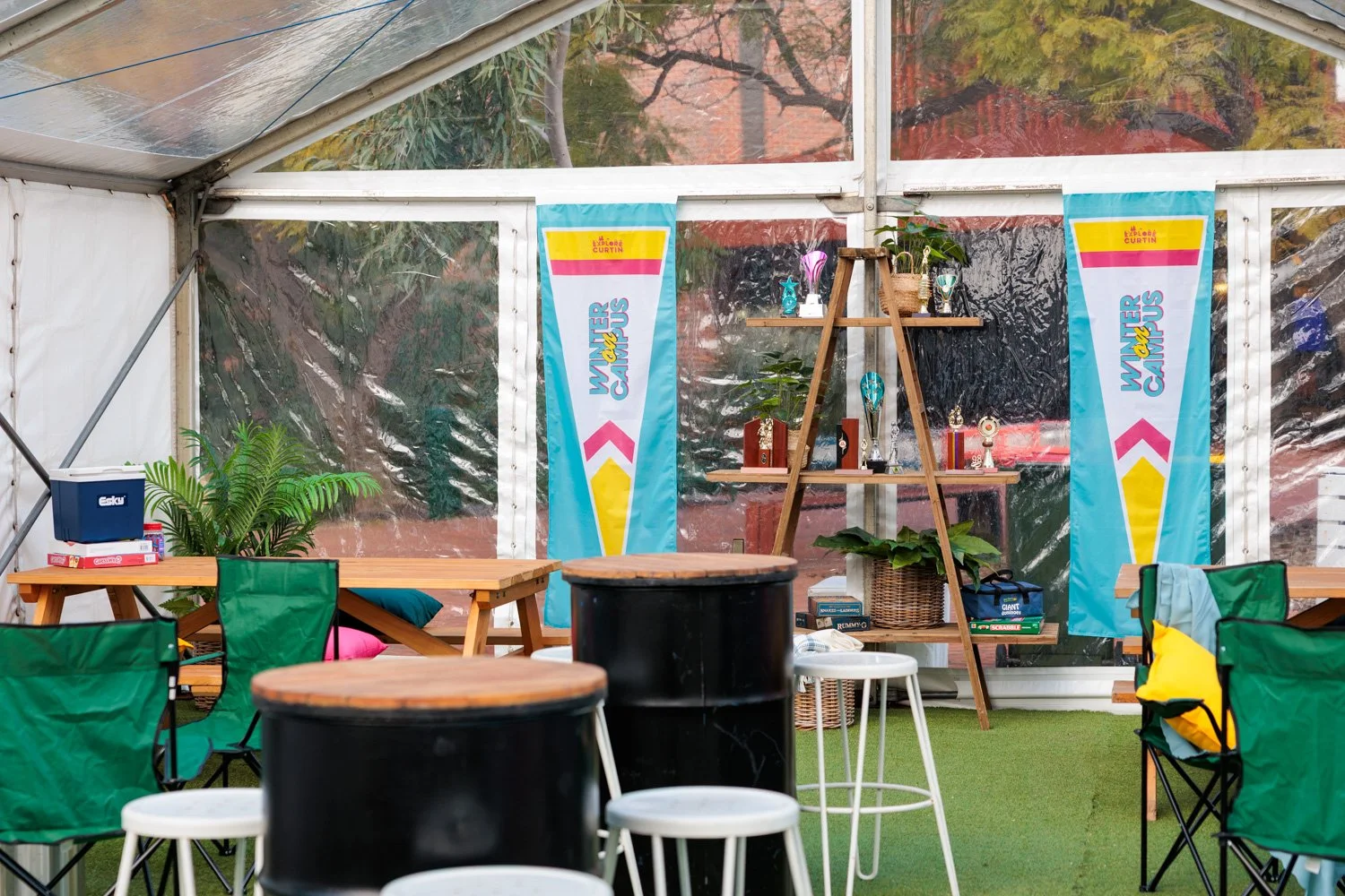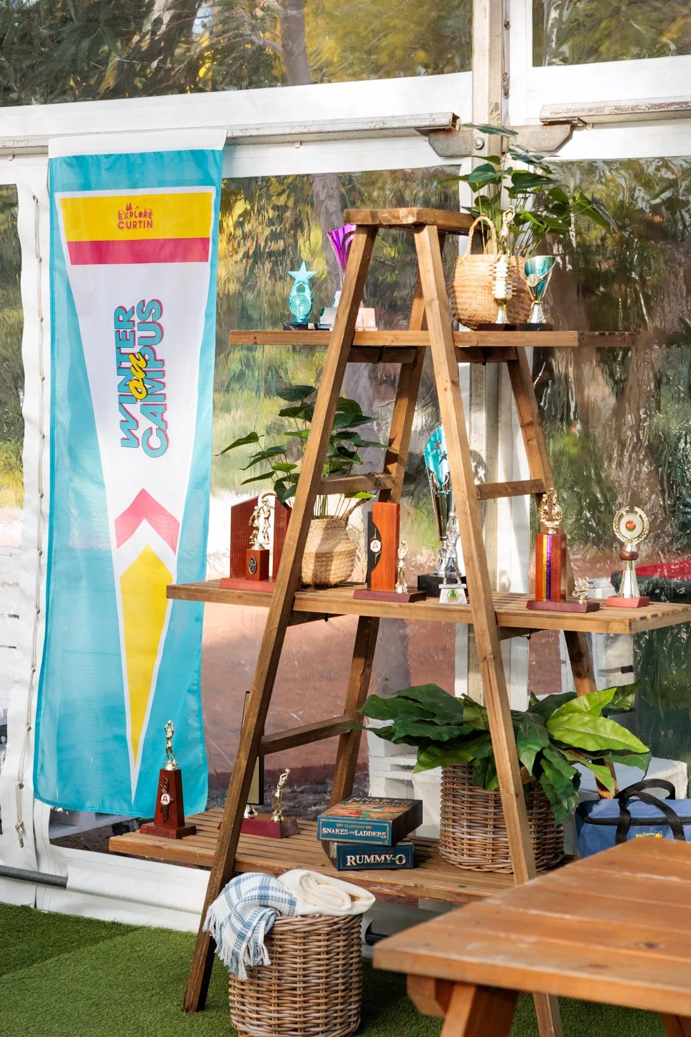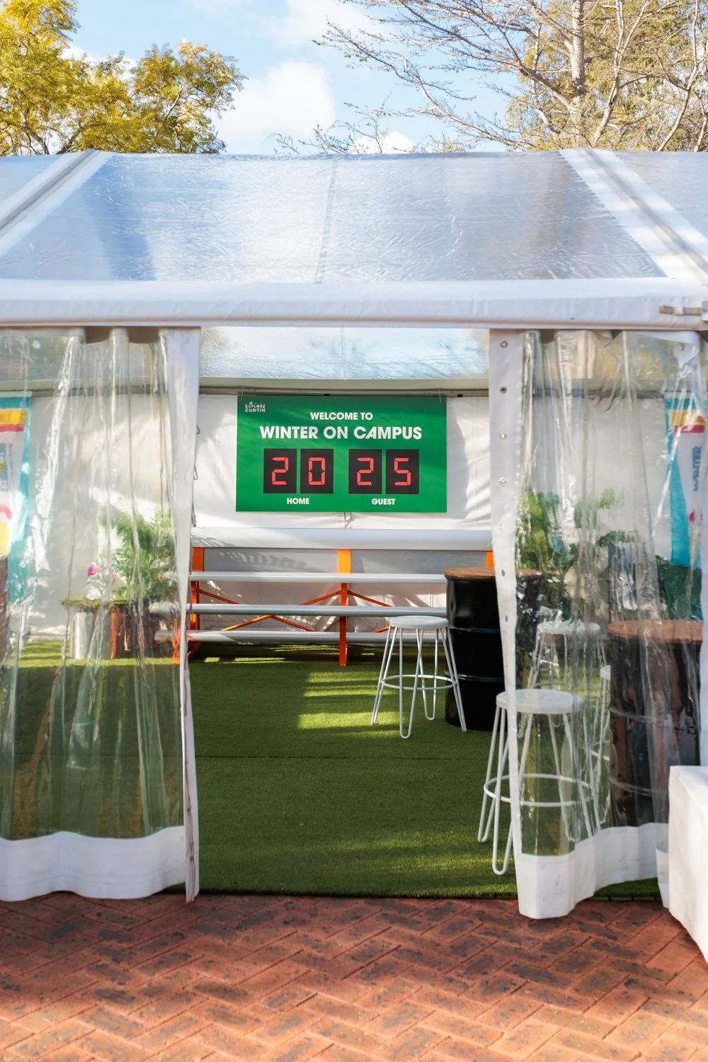 Winter-retro-sports themed design and styling for Curtin University student activation. Featuring stadium seating, custom printed scoreboard, vintage trophies, cosy seating areas, canteen-style cart, and styling to create a unique placemaking moment inspired by the sports events of the 90’s.