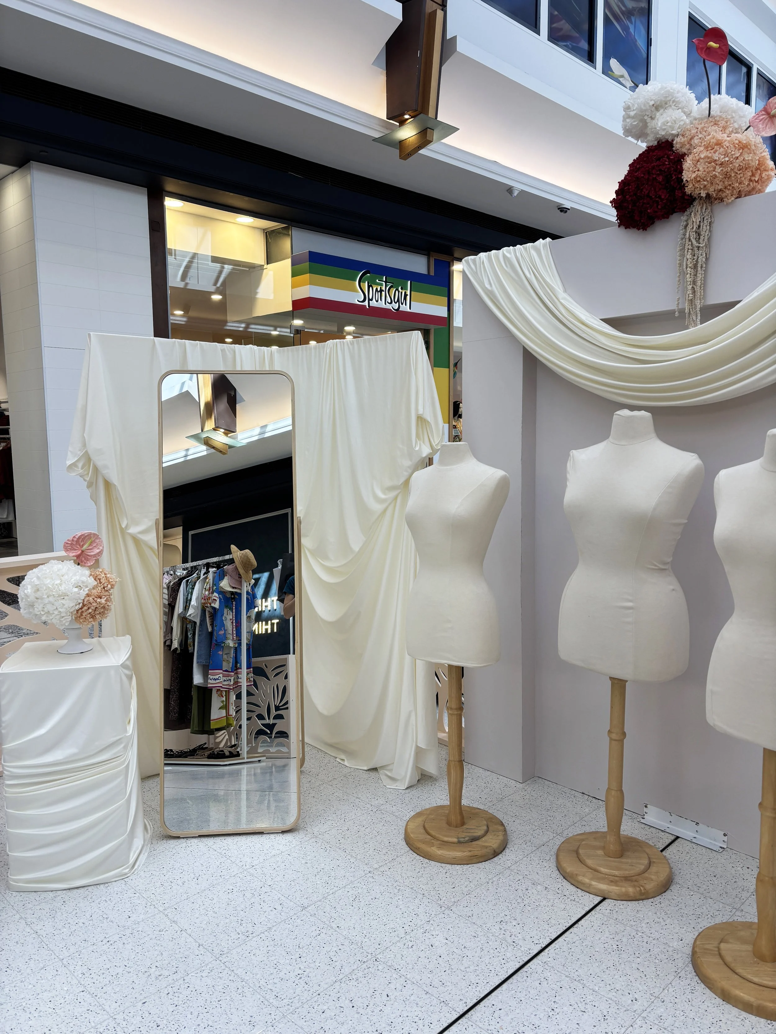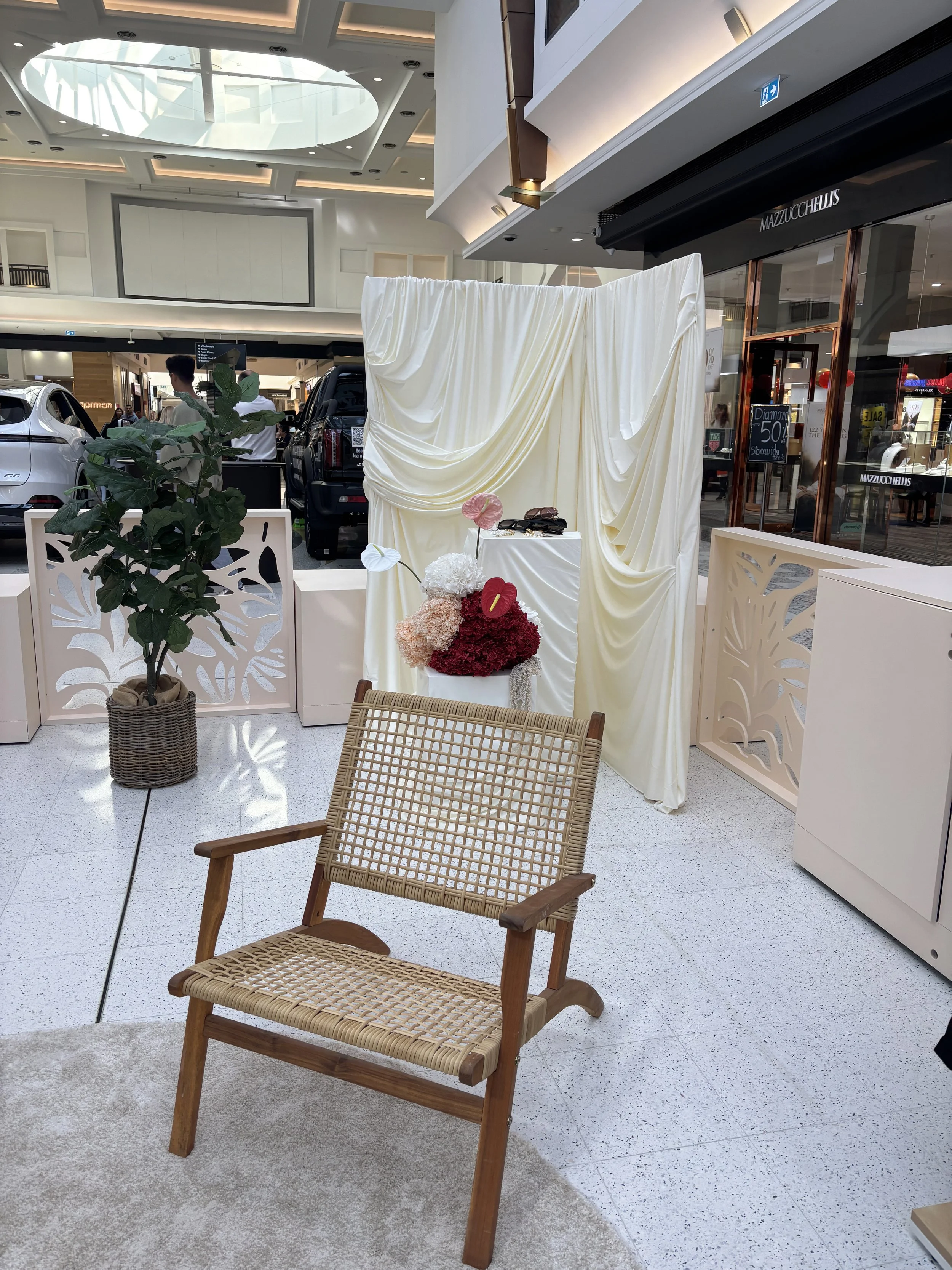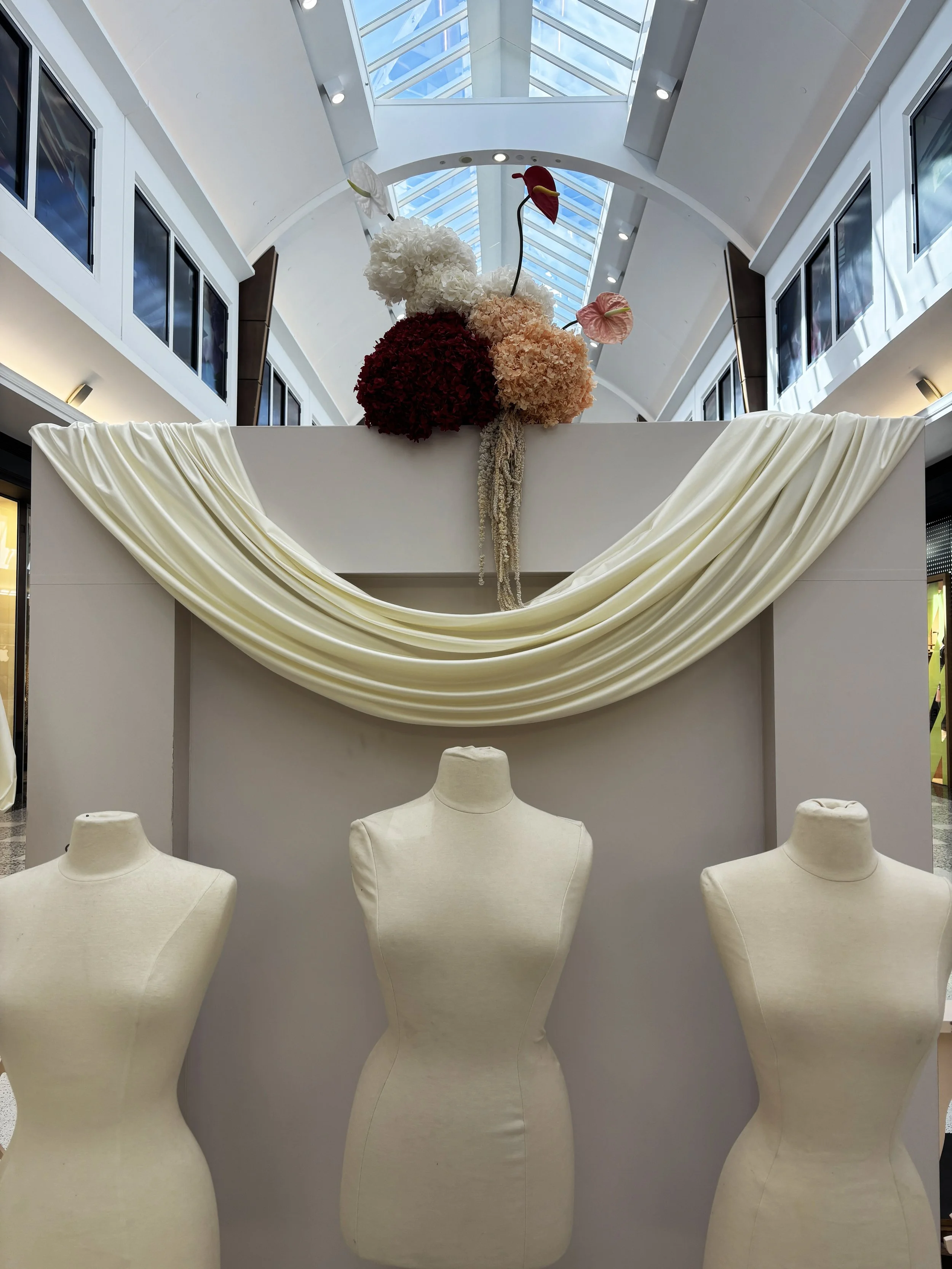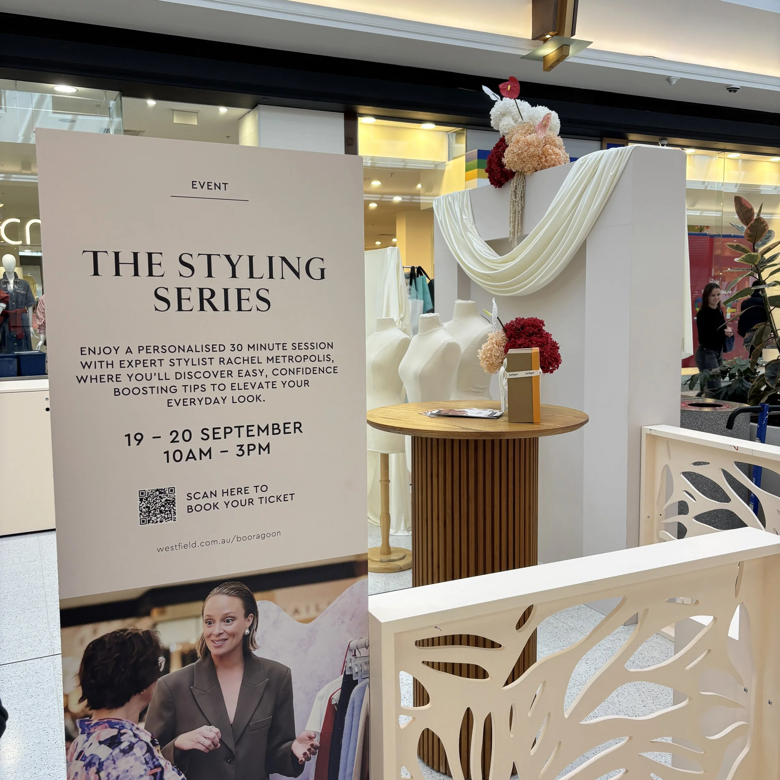 Pop-Up Shopping Centre Style hubStyling, drapery, florals and layout for this pop-up style hub at Westfield Booragoon.Floral Installation | Visual Merchandising | Drapery
