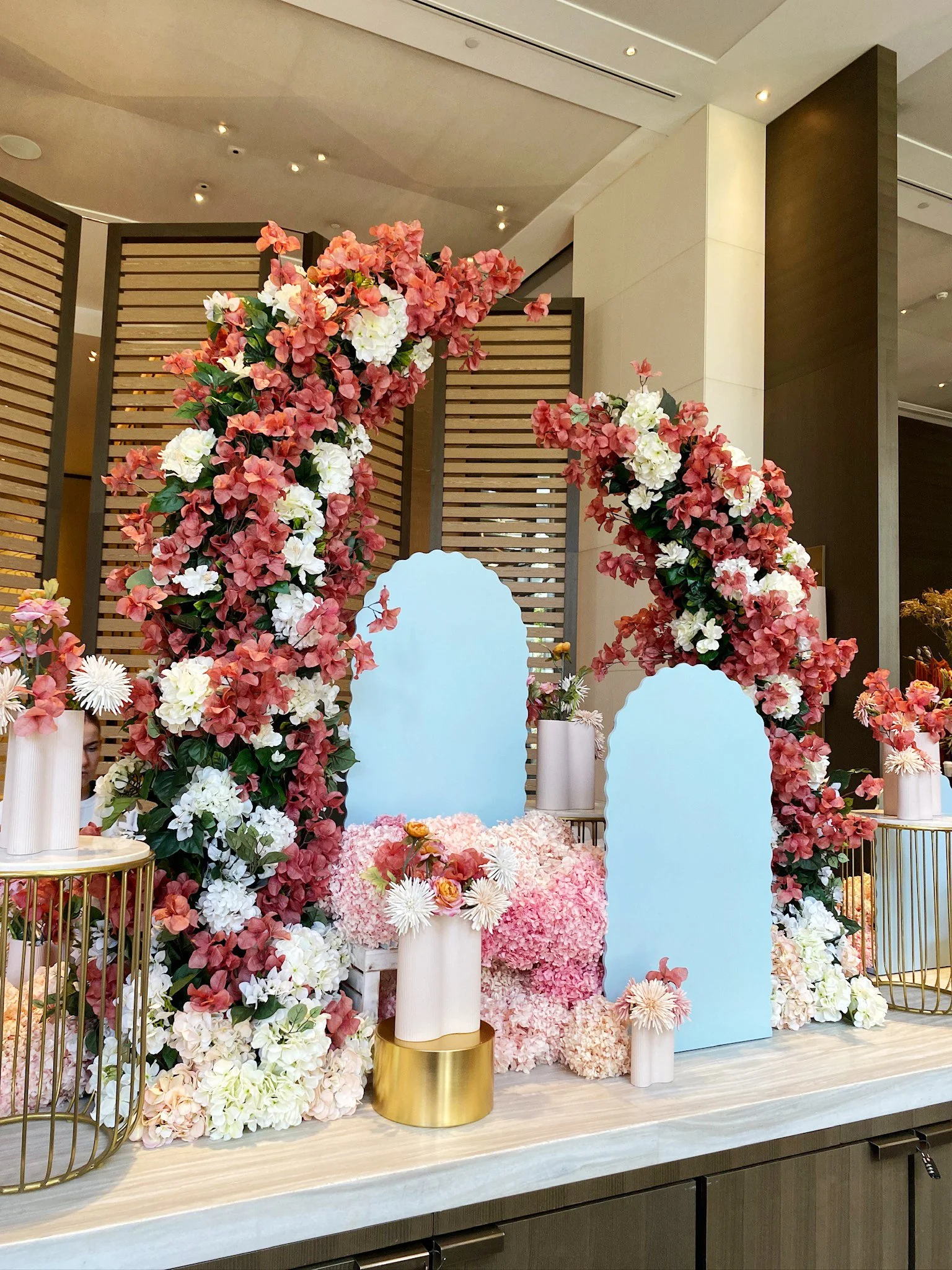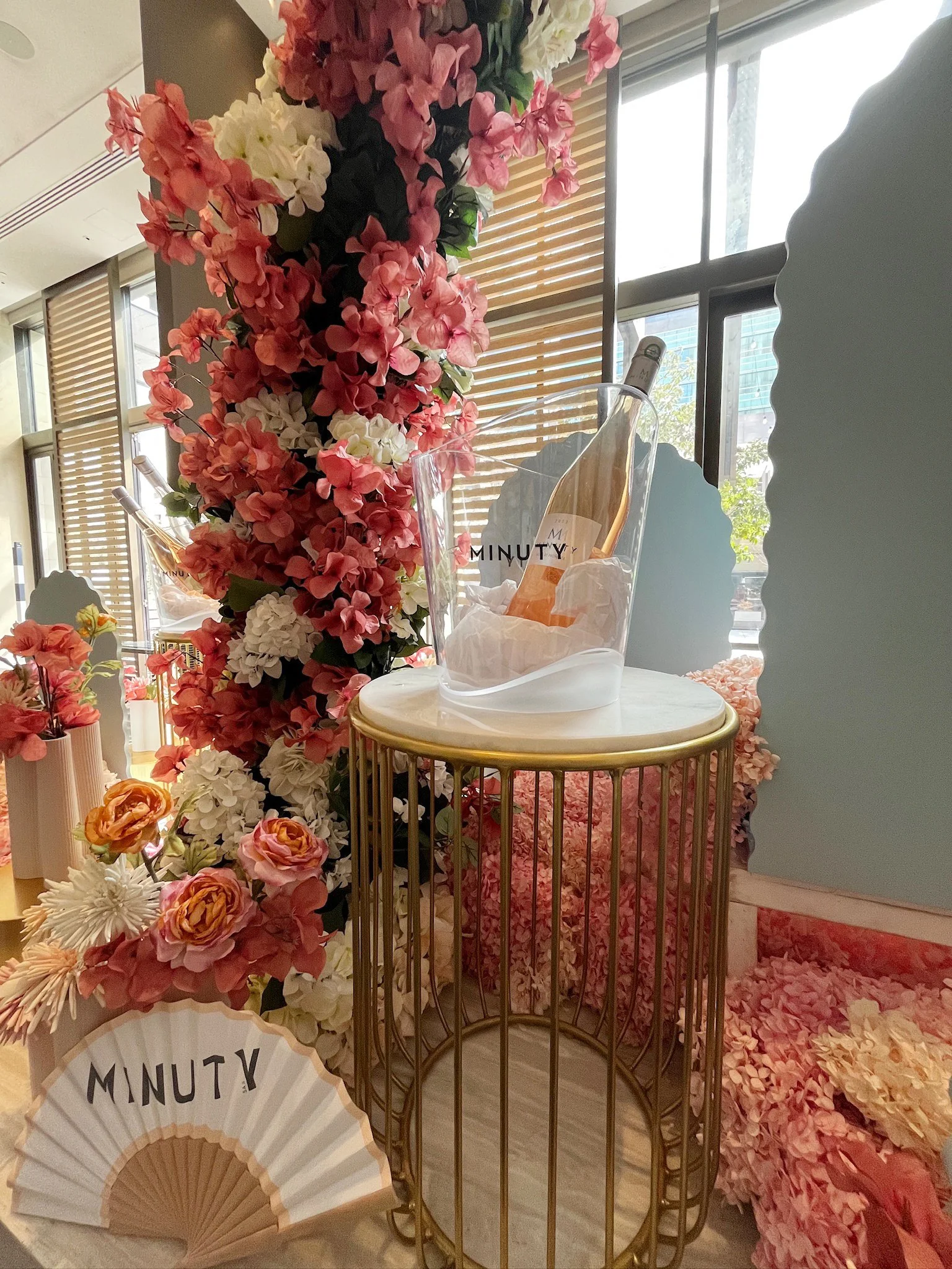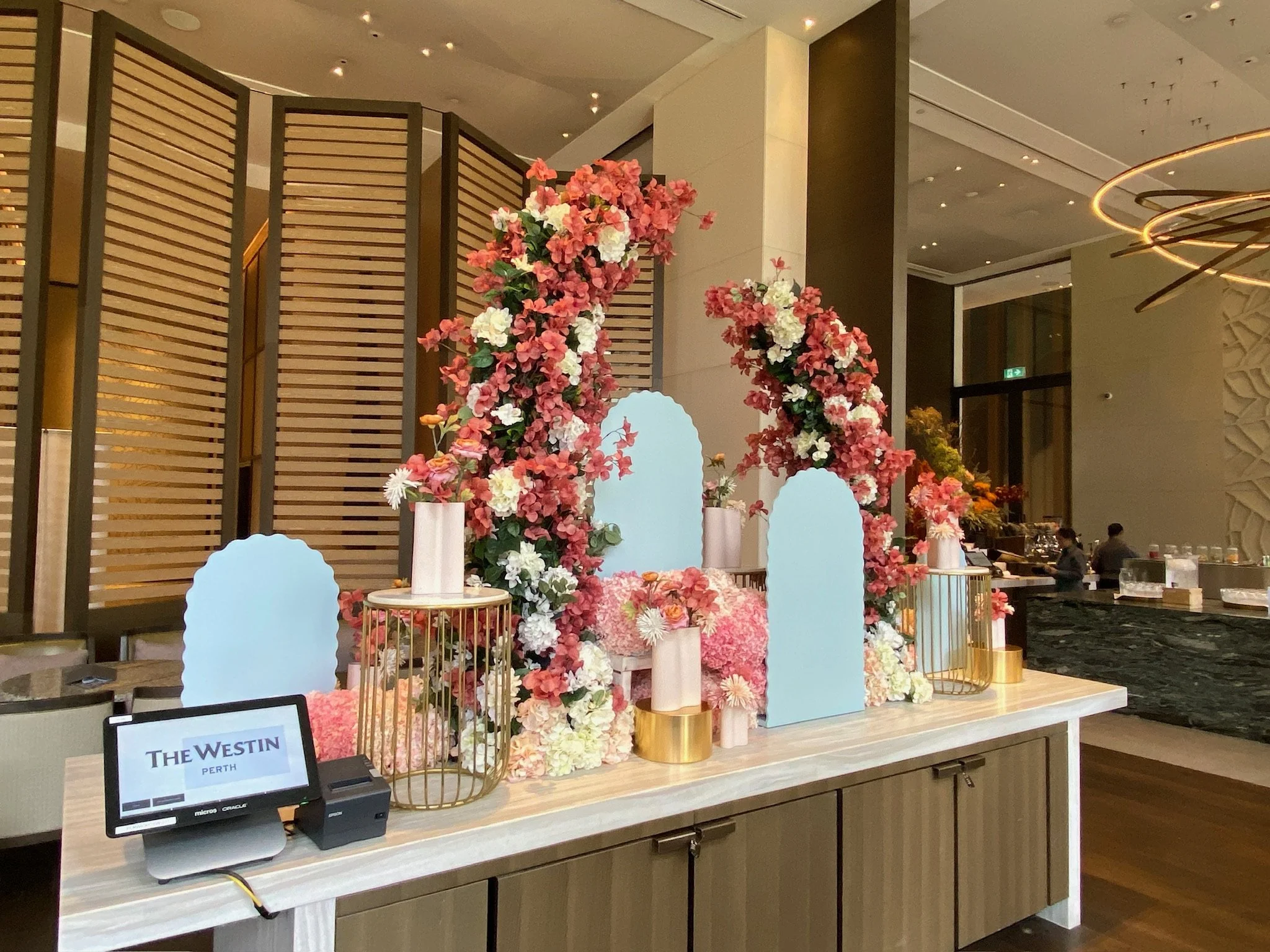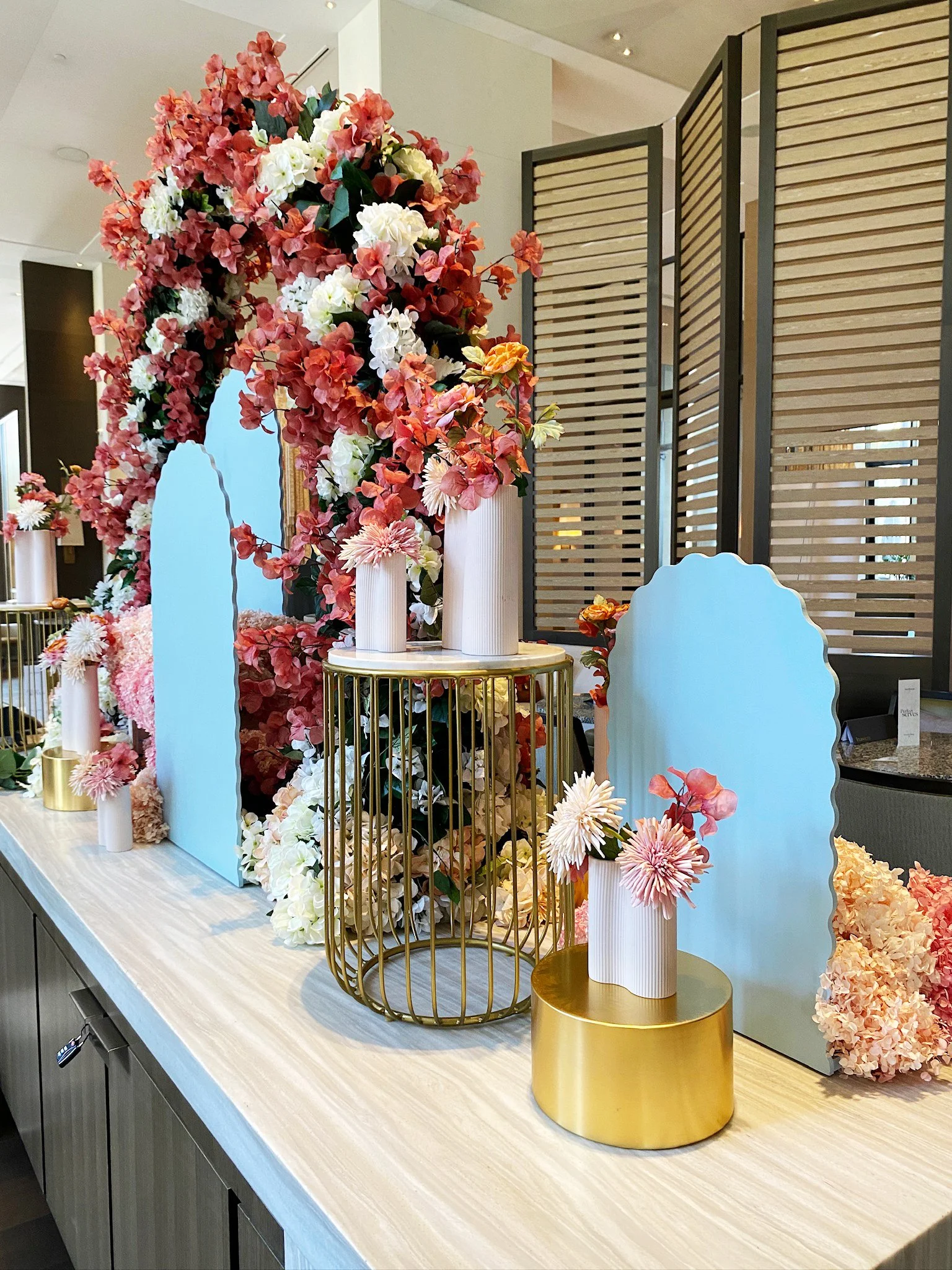 Floral installation and product styling for the St Tropez High Tea at Haven Lounge, to display the Minuty Brand at The Westin, Perth. Flower towers, pink and white florals with contrasting blue arches, visually inspired by the streets of St Tropez.
