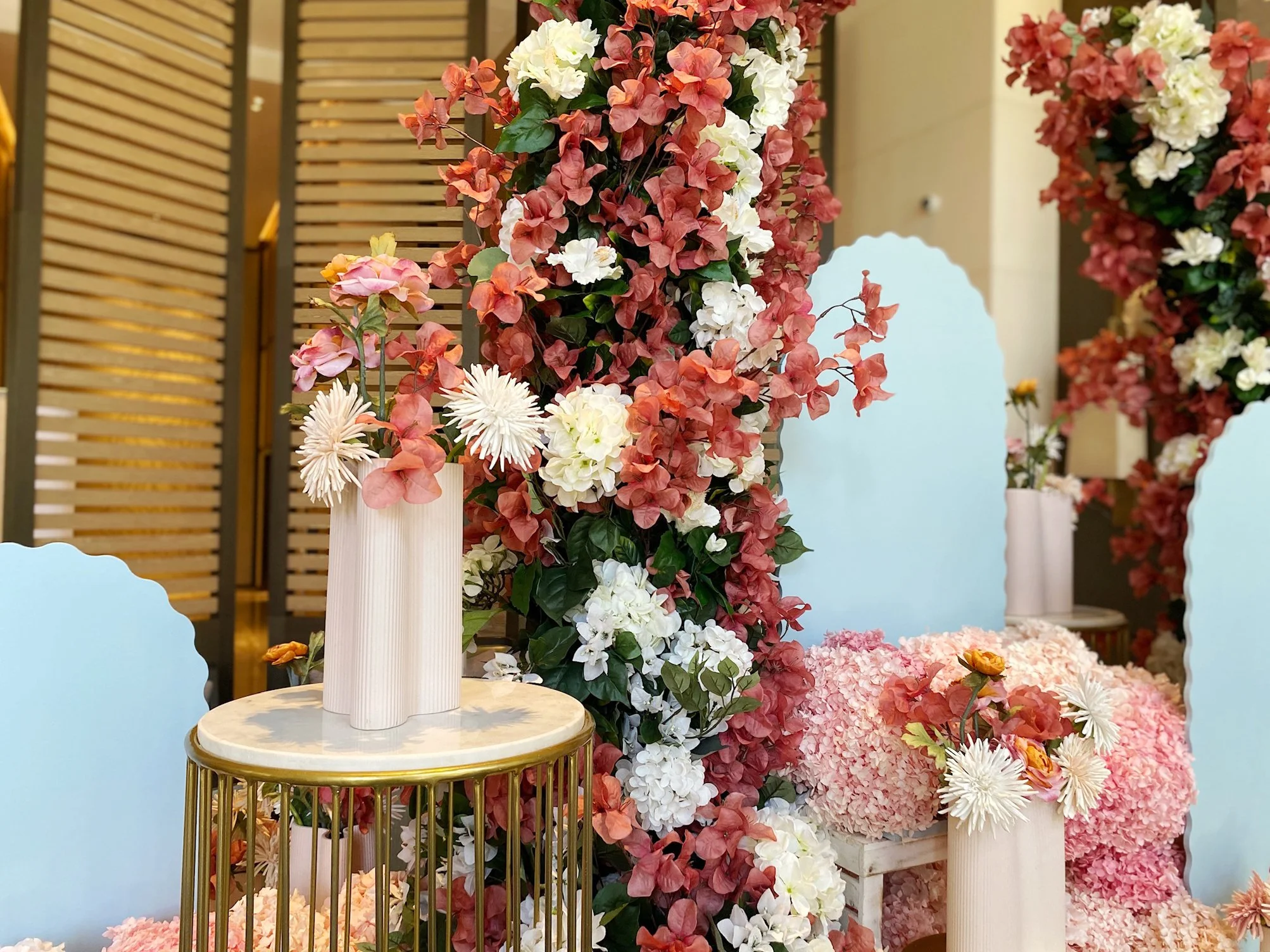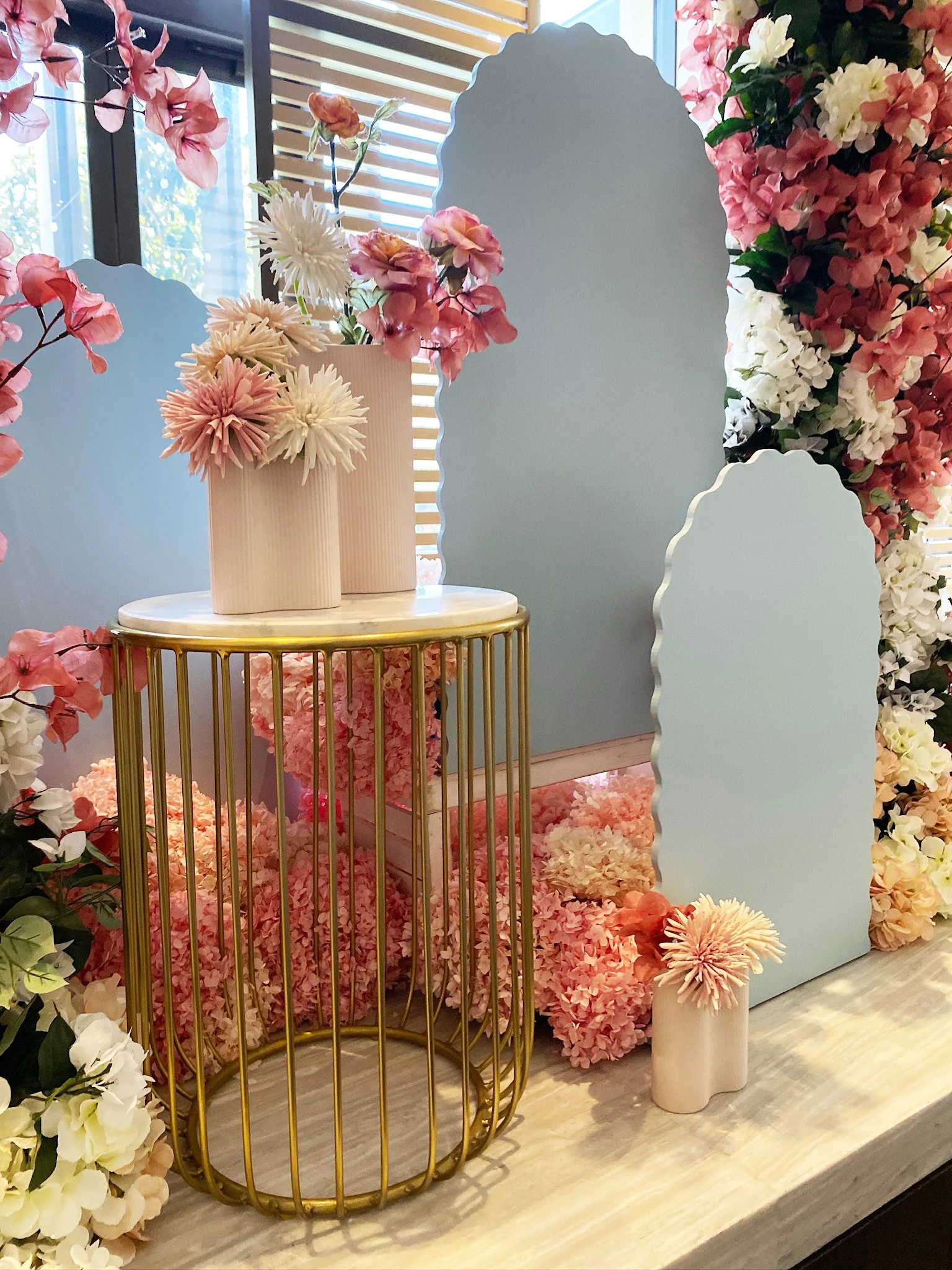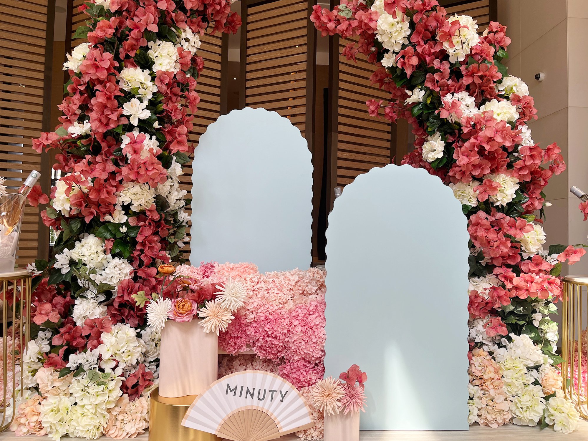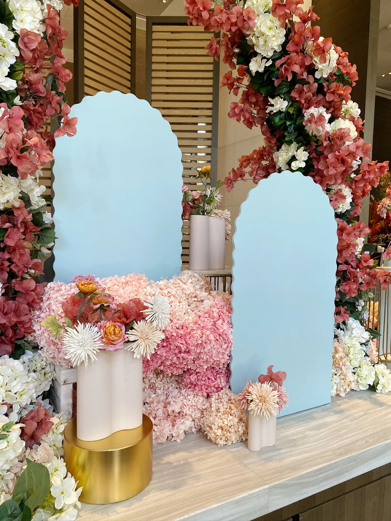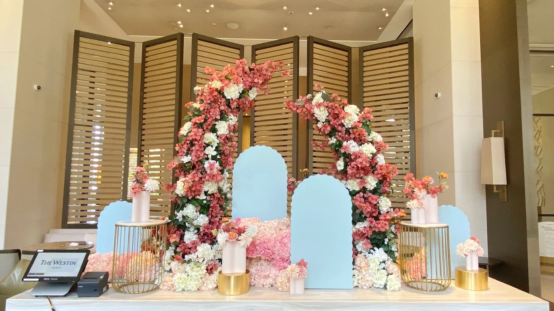 Floral installation and product styling for the St Tropez High Tea at Haven Lounge, to display the Minuty Brand at The Westin, Perth. Flower towers, pink and white florals with contrasting blue arches, visually inspired by the streets of St Tropez.